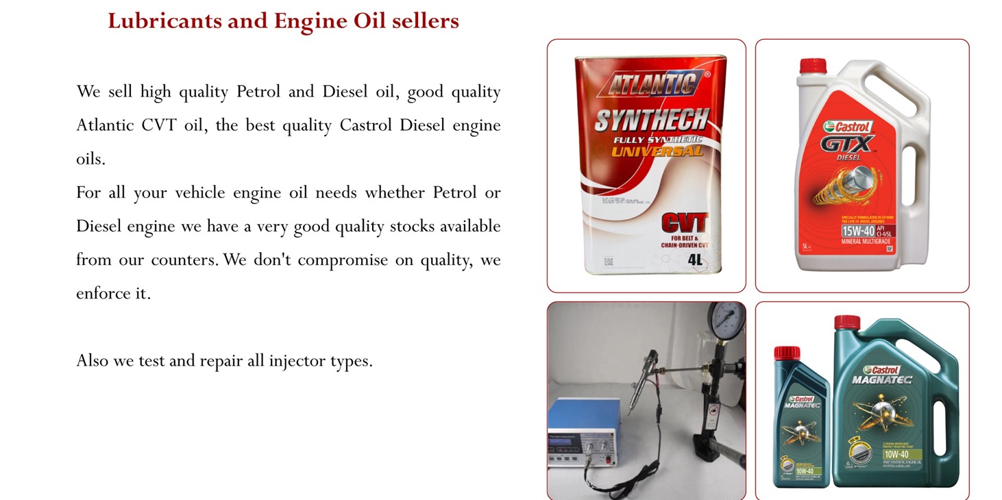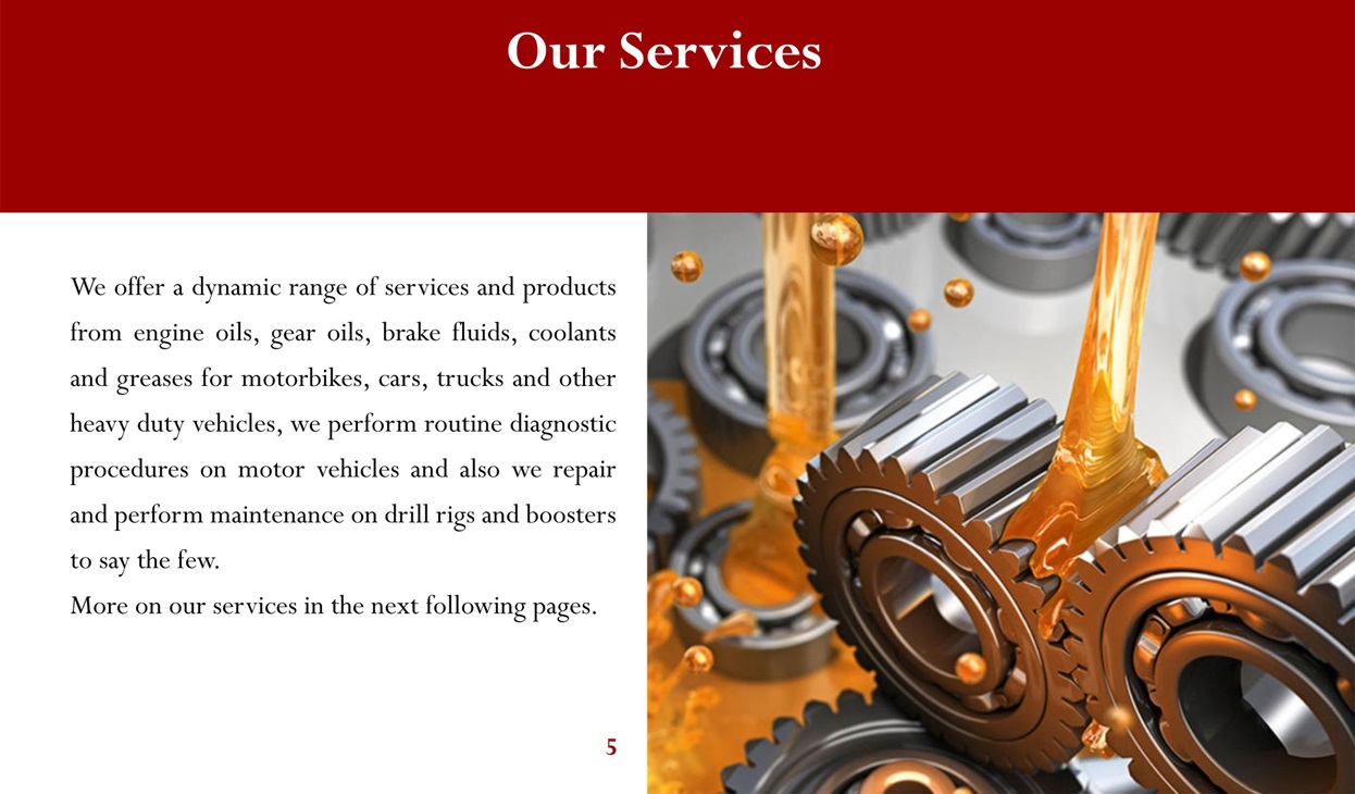 We offer a dynamic range of services and products from engine oils, gear oils, brake fluids, coolants and greases for motorbikes, cars, trucks and other heavy duty vehicles, we perform routine diagnostic procedures on motor vehicles and also we repair and perform maintenance on drill rigs and boosters to say the few. More on our services in the next following pages.